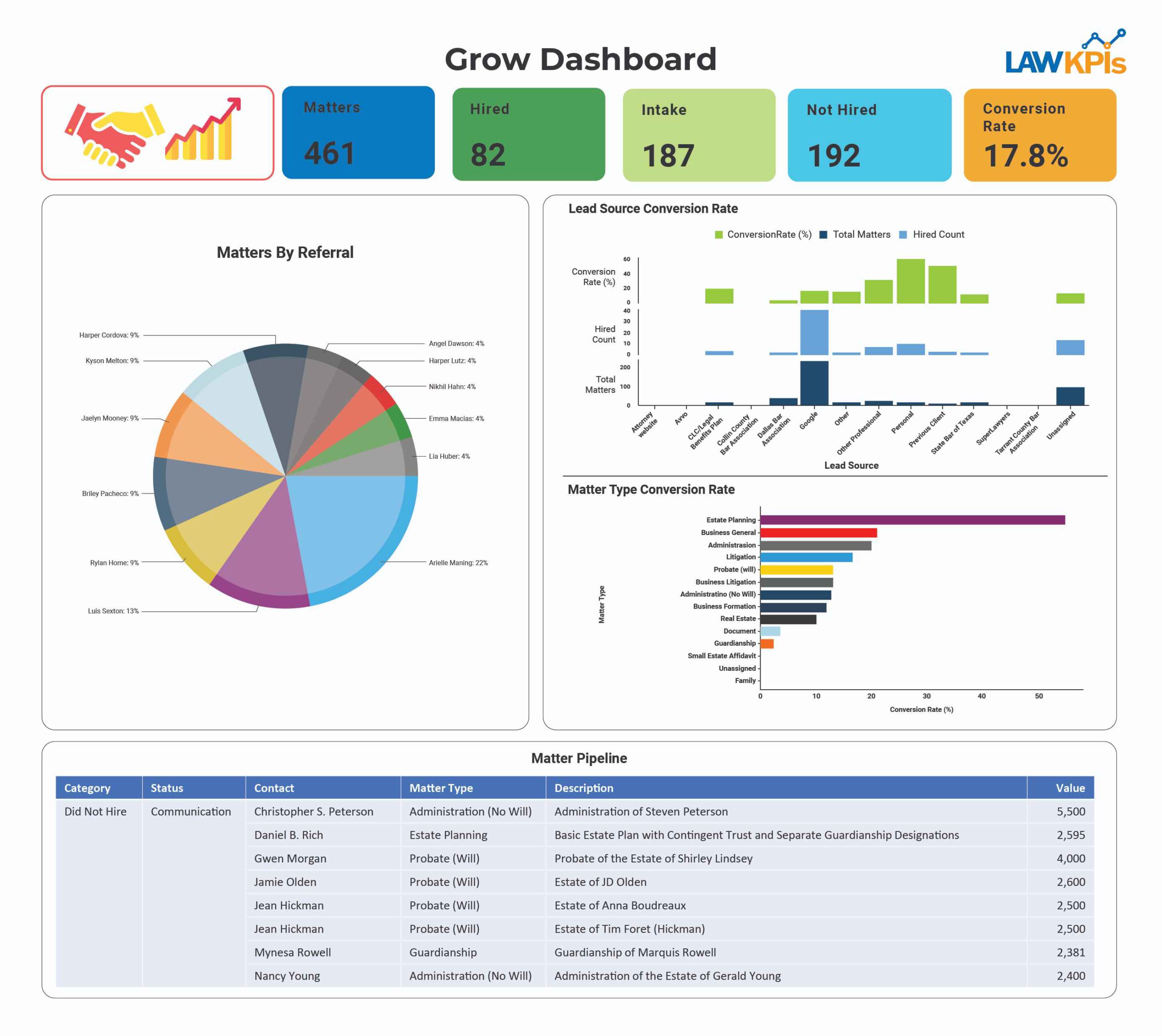 The Grow Insights Dashboard helps Clio Grow users streamline their client intake process and improve conversions. Gain a valuable insights into lead conversion rates, referral source effectiveness, matter type performance, and pipeline stage analysis. With insights into your pipeline value across stages and detailed conversion metrics, this dashboard empowers you to optimize your client acquisition strategy, identify areas for improvement, and drive sustainable growth for your firm.