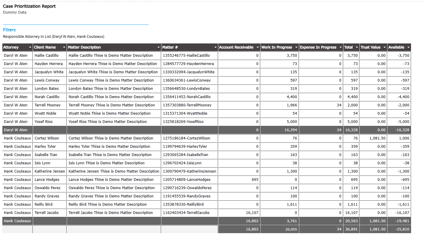 1. Decision Making: Attorneys can use the report to decide which matters require immediate attention or resources, based on financial urgency and client importance.